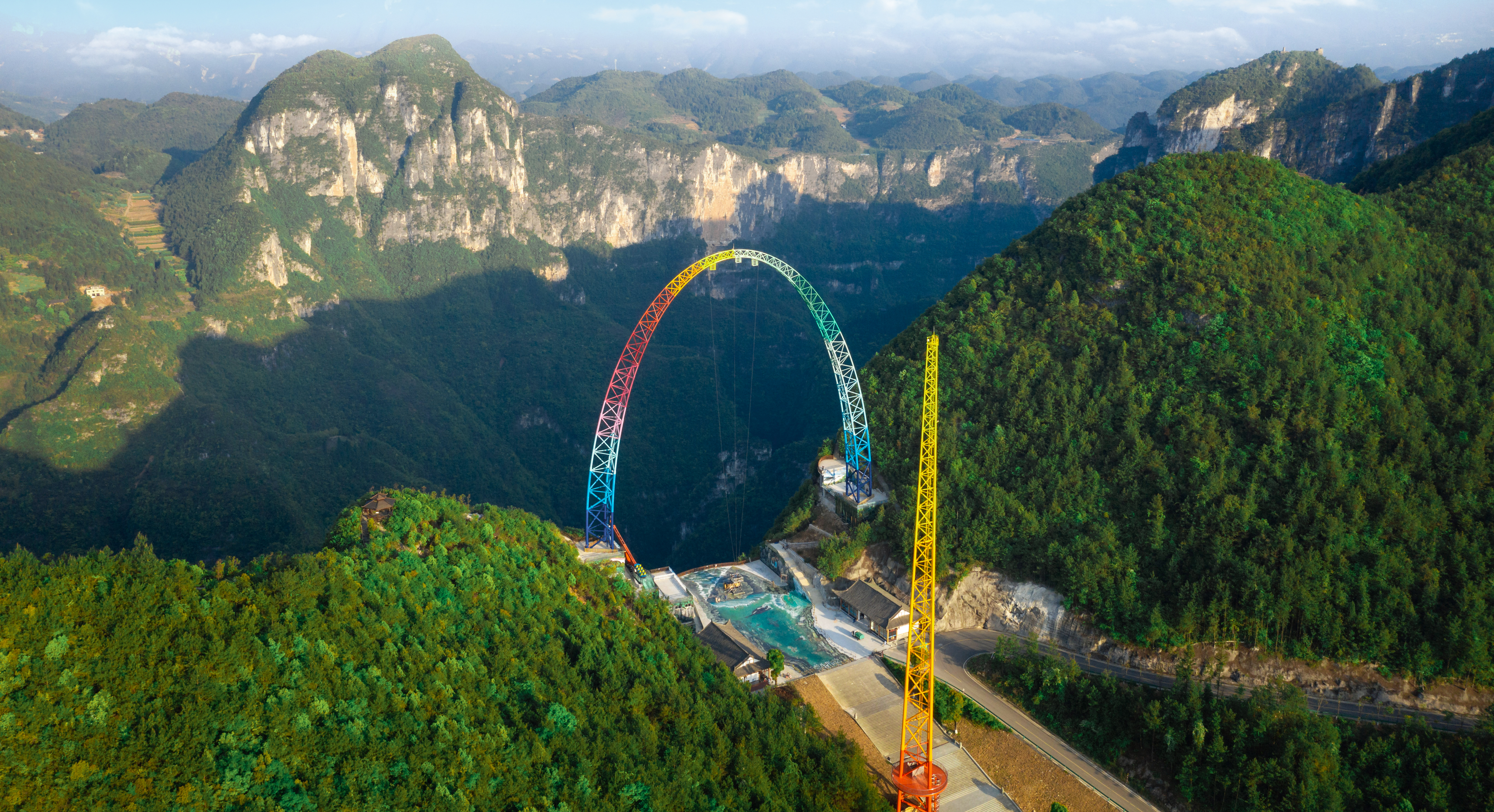 由中冶設備院自主研發(fā)、設計、制造、安裝的云端彩虹秋千,坐落于重慶龍缸5A景區(qū)700米的懸崖邊緣,主體由高100米、基礎(chǔ)跨距87.6米的彩虹涂裝拱形塔和高108米的提升發(fā)射塔等部分組成,該設備最大提升高度88m,最大運行速度可達130km/h,以“世界最高的框架秋千”稱號被載入吉尼斯世界紀錄。